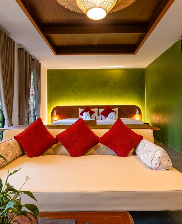Set within a private garden, this room features a stylish living area with a sofa and queen-size beds, plus a spacious private balcony. It’s an ideal retreat for families or couples seeking relaxation.